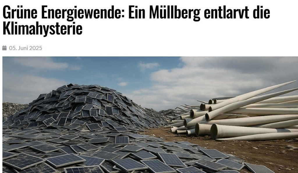 Report24 im Artikel „Grüne Energiewende: Ein Müllberg entlarvt die Klimahysterie“ v. 05.06.2026 schreibt: